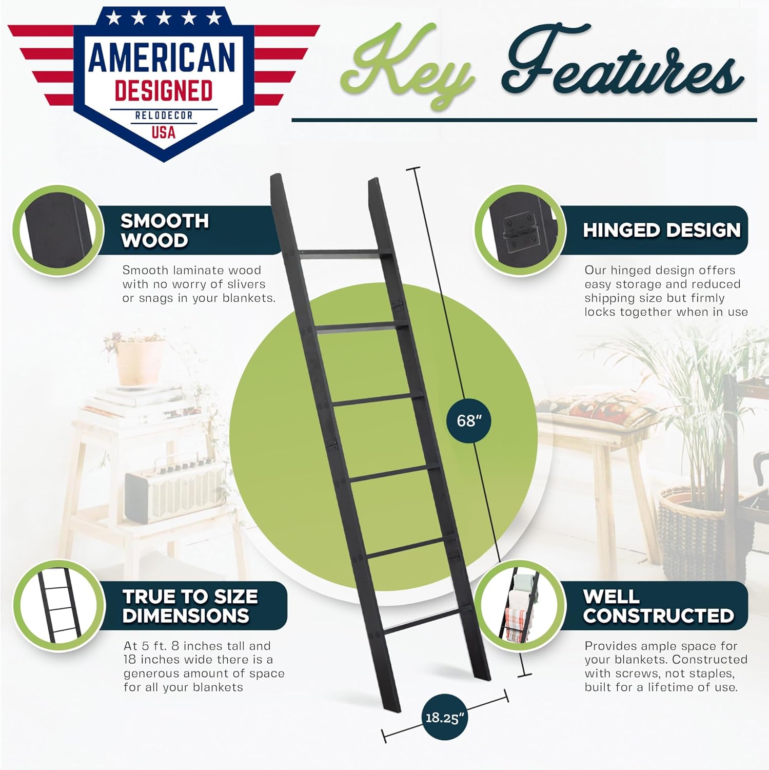 Blanket Ladder for The Living Room and Bedroom, 5ft 8 inch, 6-Tier Wall Leaning Laminate Snag Free Material (Black) Rustic Decorative Farmhouse Blanket Rack, Quilt Rack, Ladder Shelf, Easy Assembly