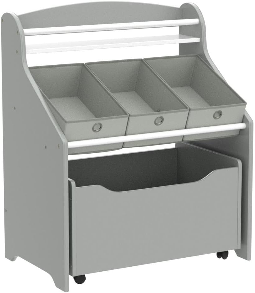 Humble Crew 3-in-1 Kids Bookshelf and Toy Storage Organizer, Grey - Toddler Organizers with Rolling Toy Box and 3 Fabric Bins – Sturdy Baby Book Shelf, Perfect for Nursery and Playroom