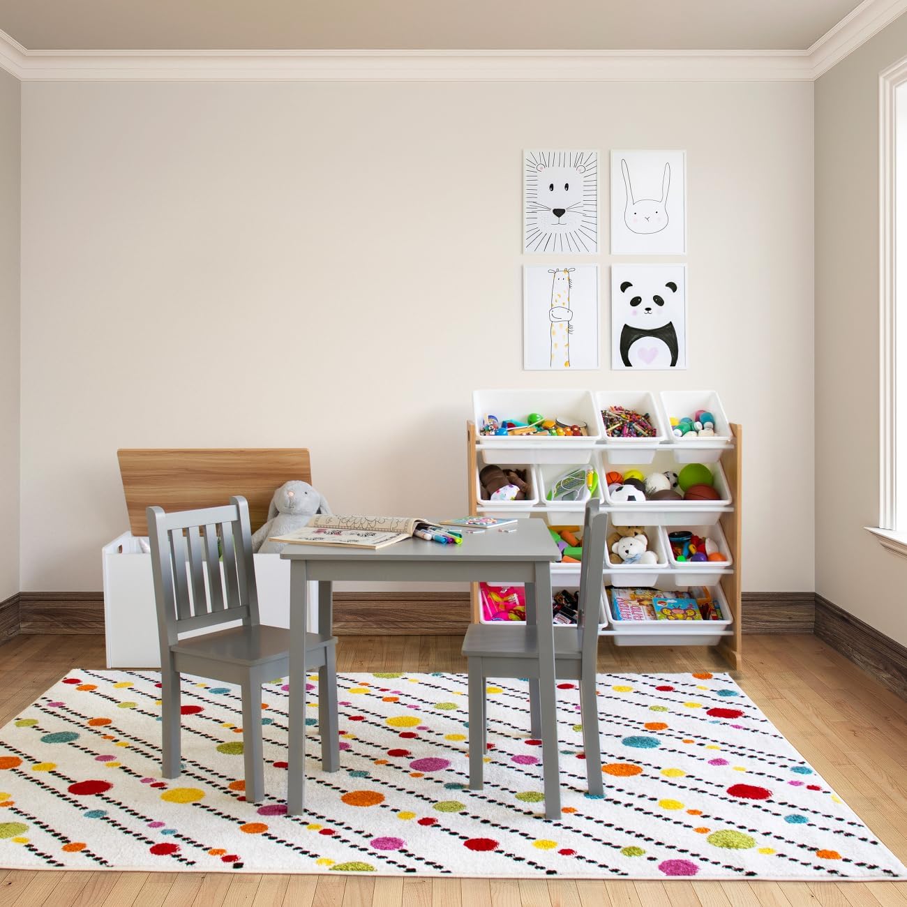 Keep your child’s playroom, bedroom, or classroom neat and organized with the Humble Crew Kids' Toy Storage Organizer with 12 Plastic Bins. This space-saving solution includes a durable, engineered wood frame and 12 removable plastic bins—8 standard and 4 large—perfect for storing toys, books, games, art supplies, and more. The colorful bins not only make it easy for kids to see and access their favorite items, but they also help teach sorting, organization, and color recognition. Designed for toddlers and preschool-aged children, the bins are just the right height to encourage independence during cleanup. The organizer features stabilizing braces and steel dowels for added strength and long-lasting use. Whether used in a nursery, playroom, or classroom, this toy bin organizer is the ideal combination of function and fun. It’s also compatible with other Tot Tutors furniture, including kids tables and chairs, bookcases, and storage benches.