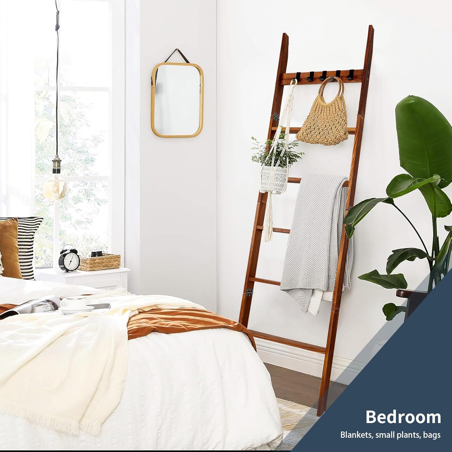 Wooden Blanket Ladder with Removable Hooks, 6-Tier 5.66 Ft (68 Inch) Rustic Blanket Rack, Blanket Ladders for Living Room & Bedroom, Easy Assembly, Perfect for Displaying Blankets & Scarves, Brown